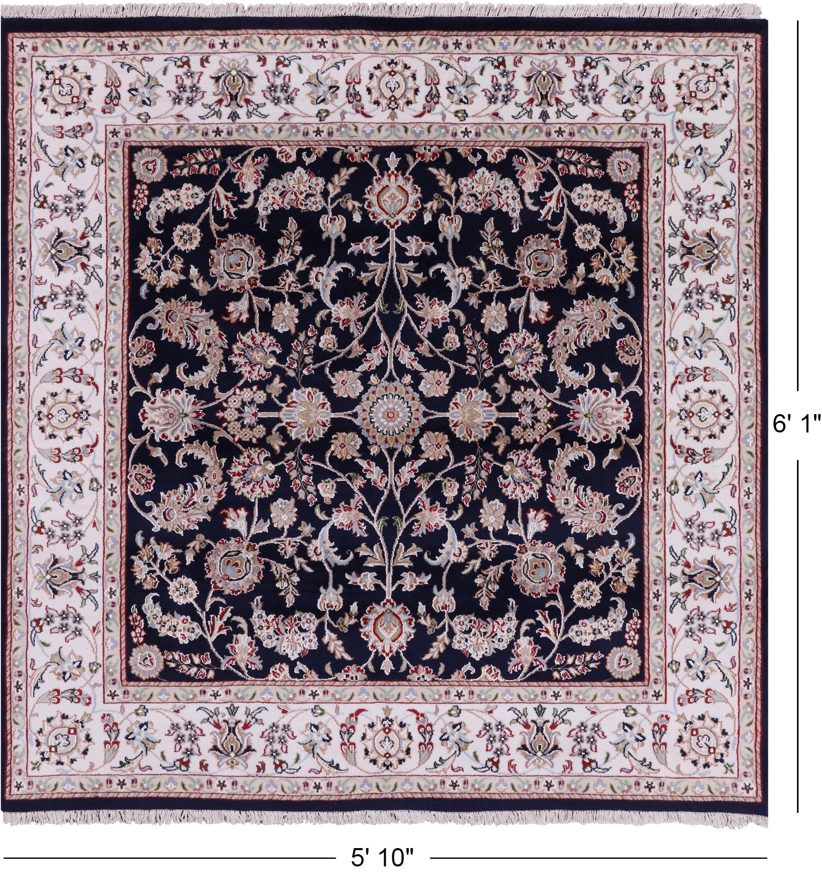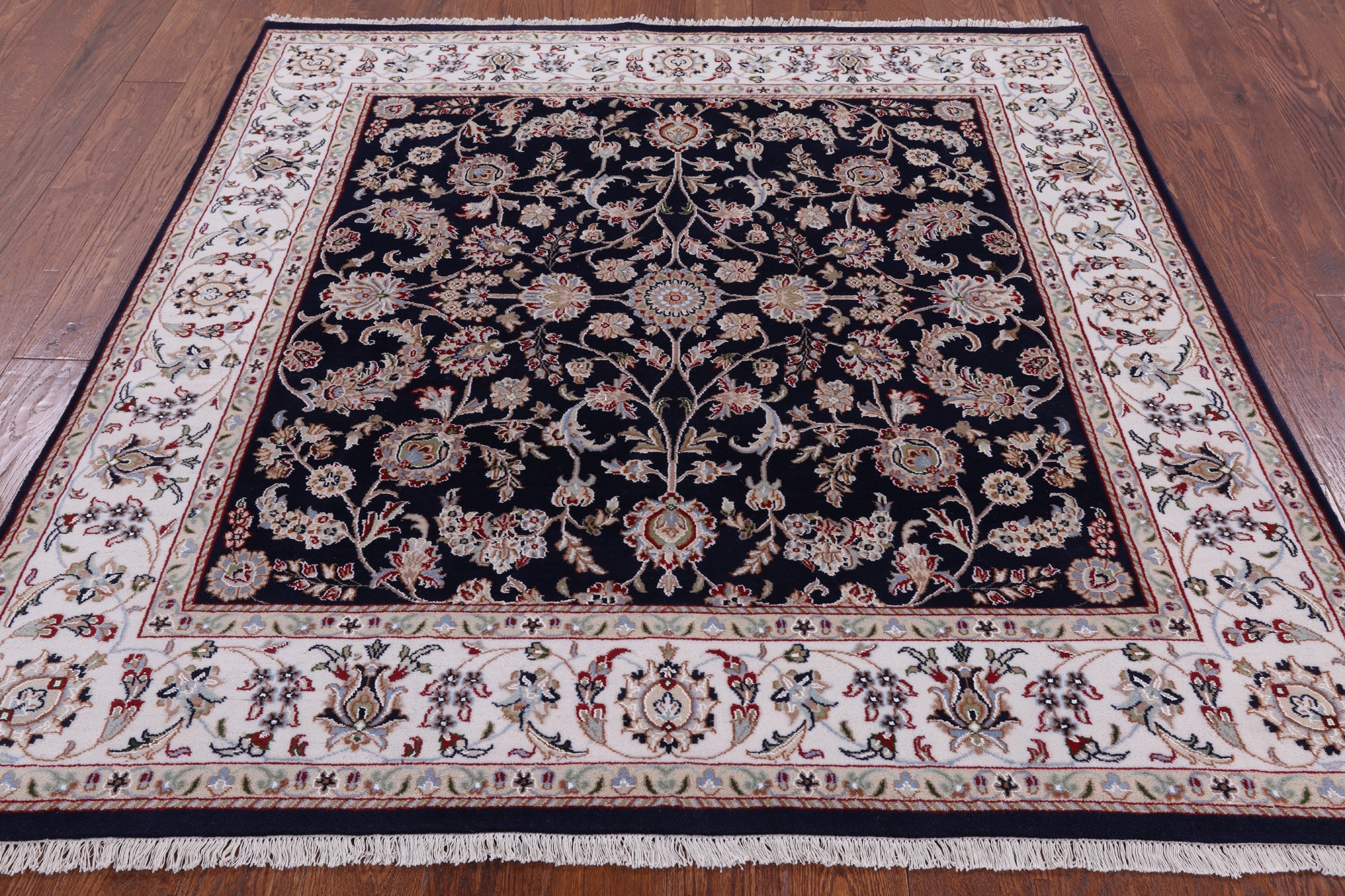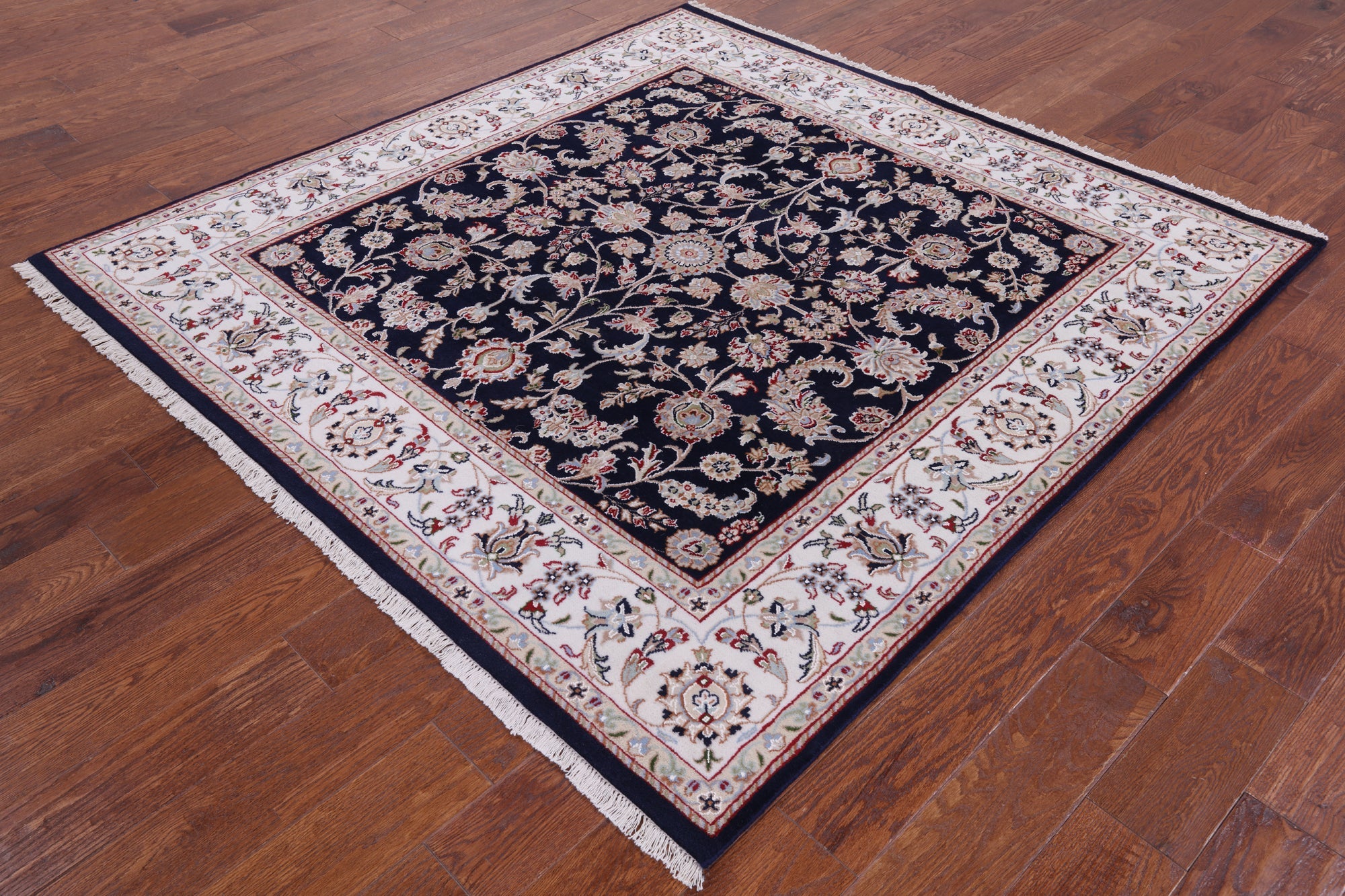 Navy Blue 6' Square Persian Nain Wool & Silk Hand Knotted Rug - Q4532