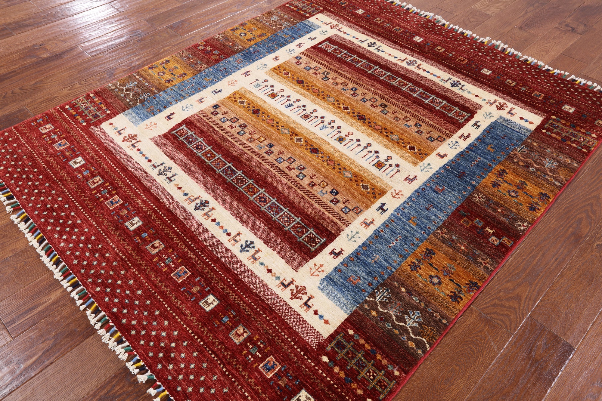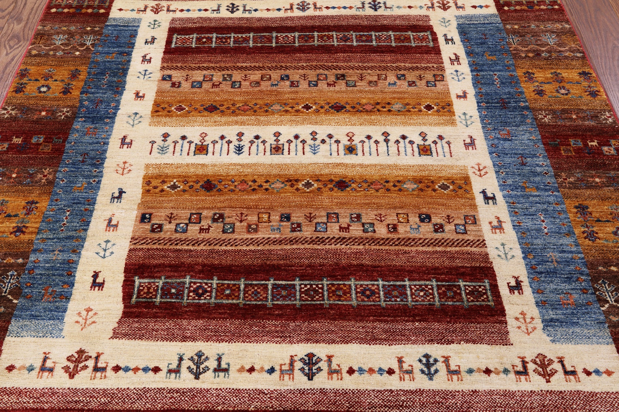 Gabbeh rugs are hand-spun wool in both the pile and the foundation, as well as all natural dyes. Simple, colorful geometric patterns, abstract scenery, child-like representations of people and animals, different colors, reds, blue, greens ,yellow, purple. Modern technology has improved the dye process to allow a wider range of colors as well as more stable and easier to care for colors.