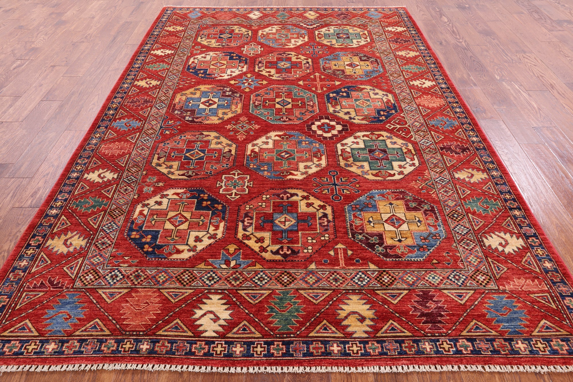Bokharas are a type of handmade Pakistani rug; also known as Bukharas or Bokaras. Most are based on Turkmen prototypes called Tekkes. Pakistani Bokhara rugs are among the most popular handmade rugs in the world. They are popular for their soft, luxurious feel, heavy pile, attractive colors and appearance that consist of repeating octagonal figures called guls, usually on fields of burgundy red, gray blue, or sometimes green.