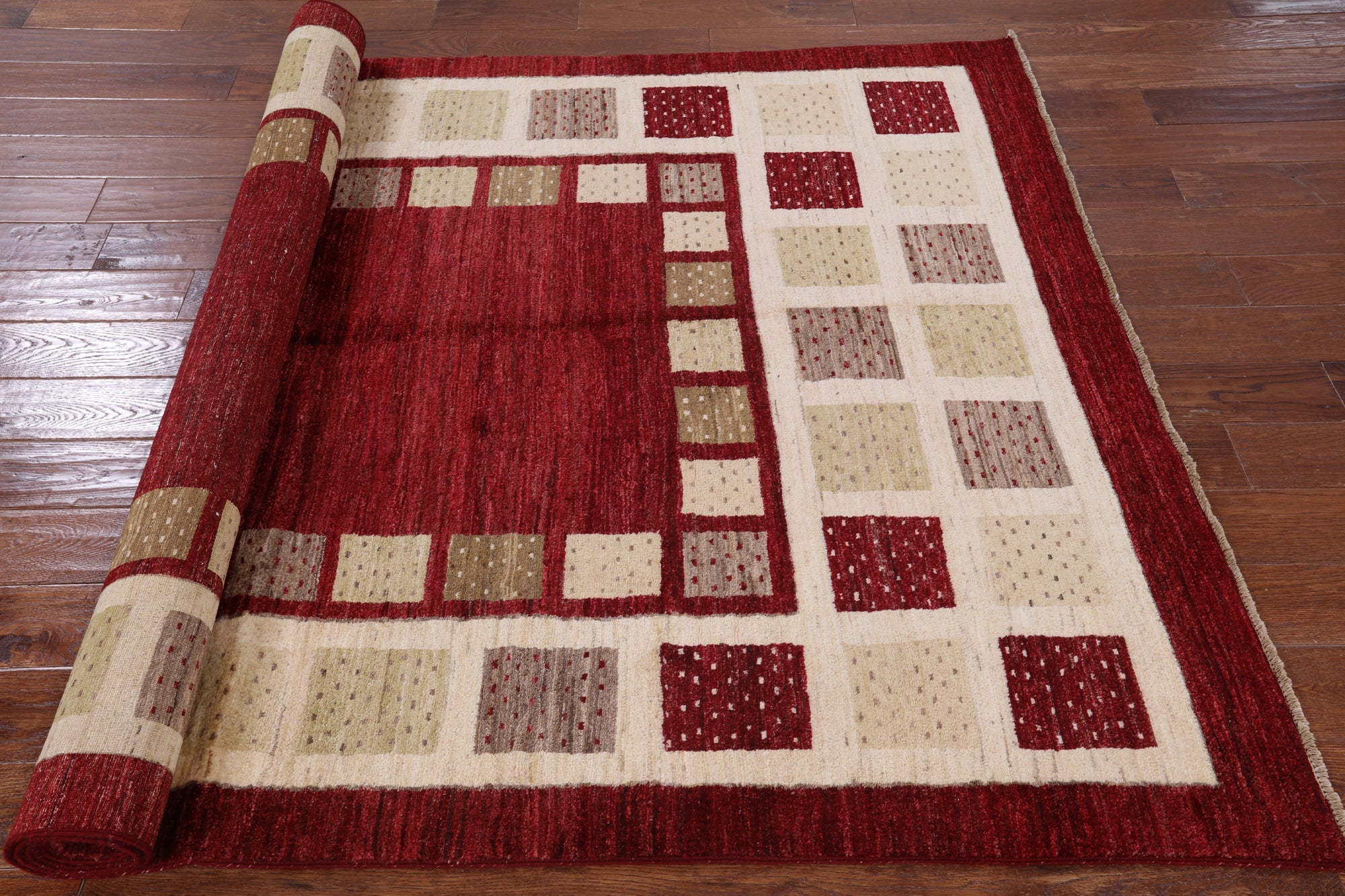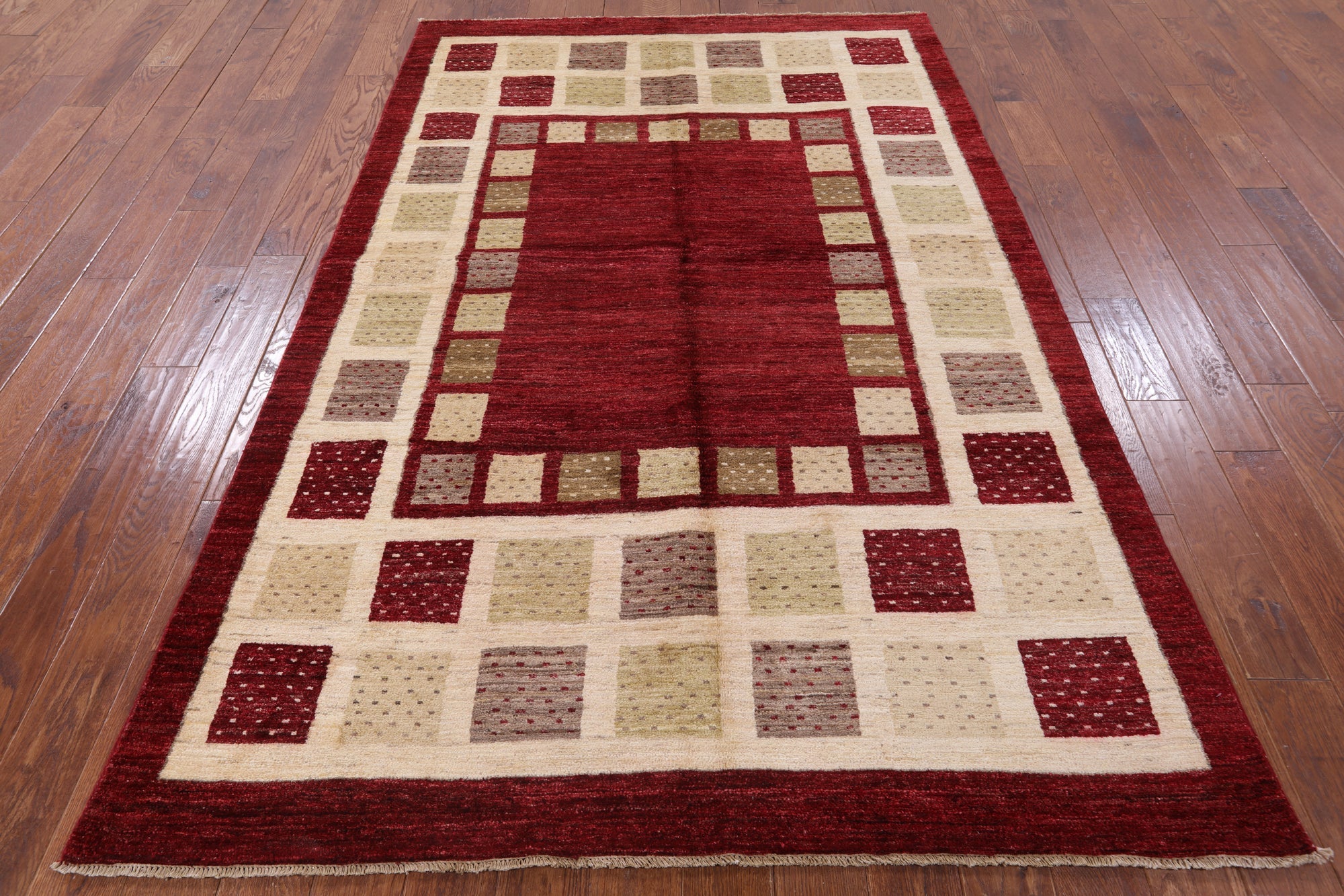 Gabbeh rugs are hand-spun wool in both the pile and the foundation, as well as all natural dyes. Simple, colorful geometric patterns, abstract scenery, child-like representations of people and animals, different colors, reds, blue, greens ,yellow, purple. Modern technology has improved the dye process to allow a wider range of colors as well as more stable and easier to care for colors.