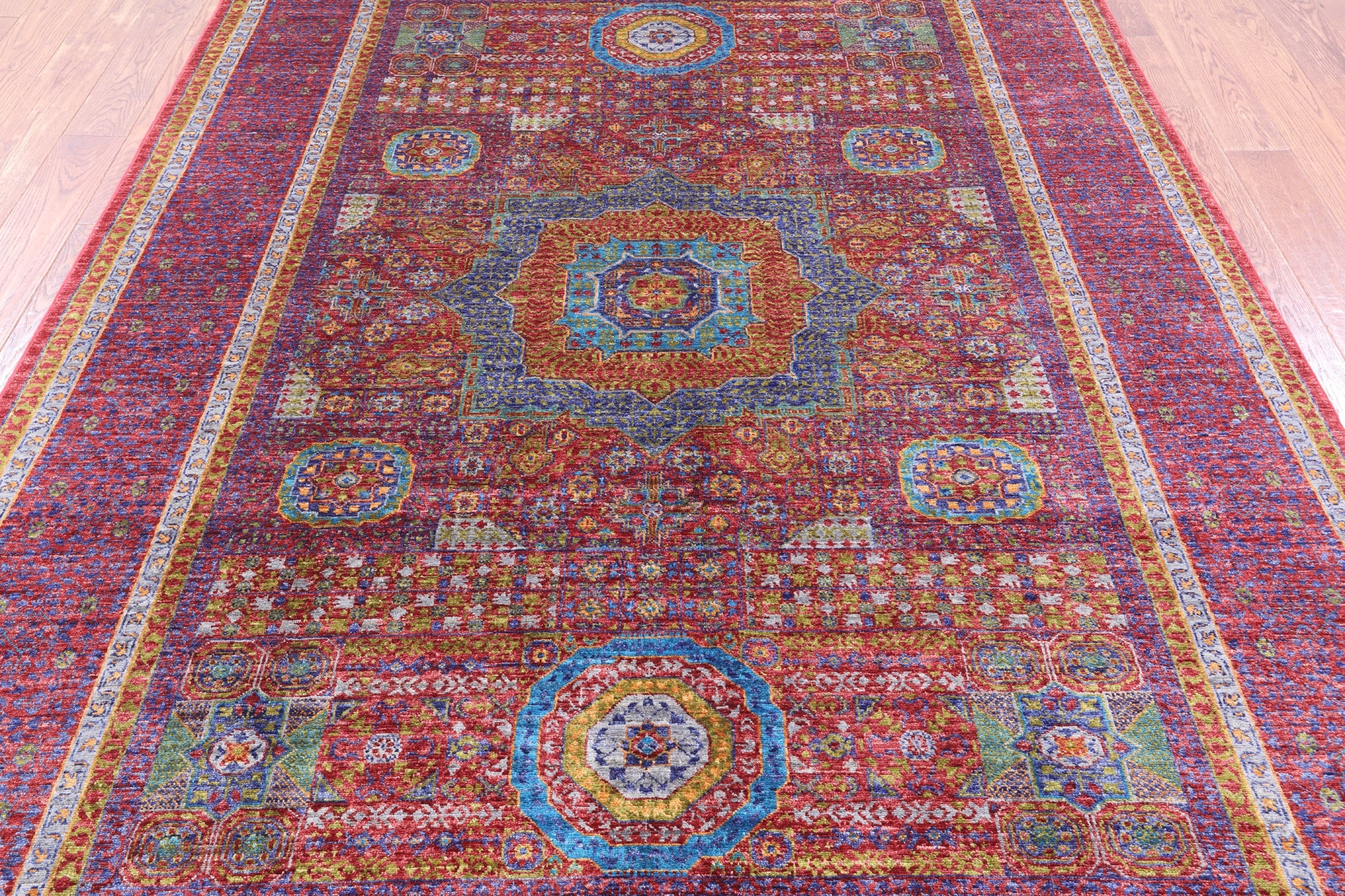 Red 6' 9" X 9' 9" Hand-Knotted Mamluk Geometric Wool Rug - Q13984 is backordered and will ship as soon as it is back in stock.