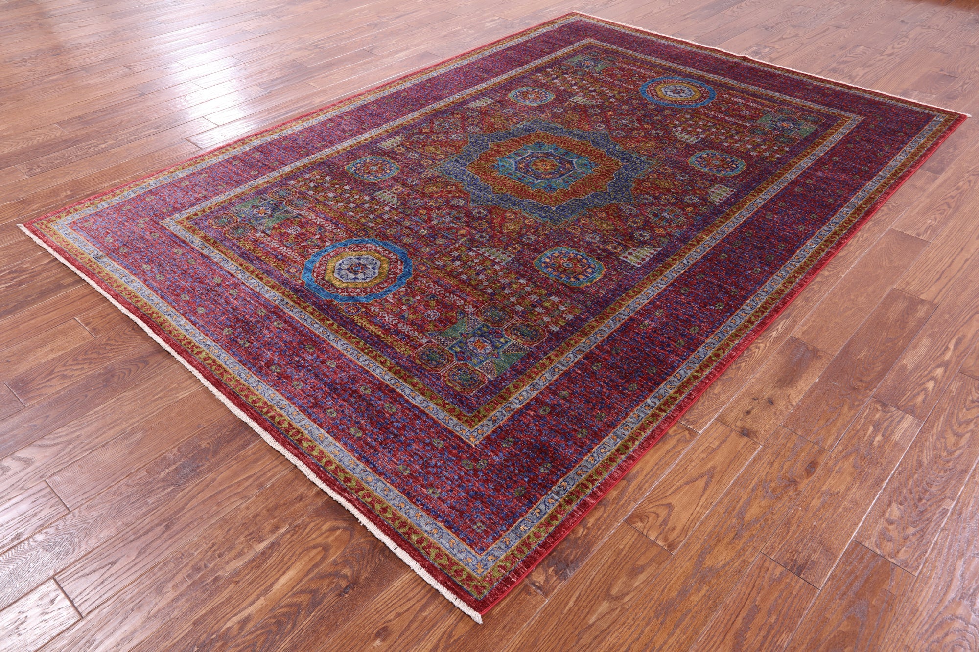Originating in Cairo, Egypt, Mamluk rugs are prominent for their amazing ability to have extremely symmetrical designs. This creates a splendid mirror-like effect. The medallions can be seen as interlacing stars and polygons, with other geometric patterns surrounding. The colors commonly used for these traditional rugs are blues, rich reds, ivory, and greens.