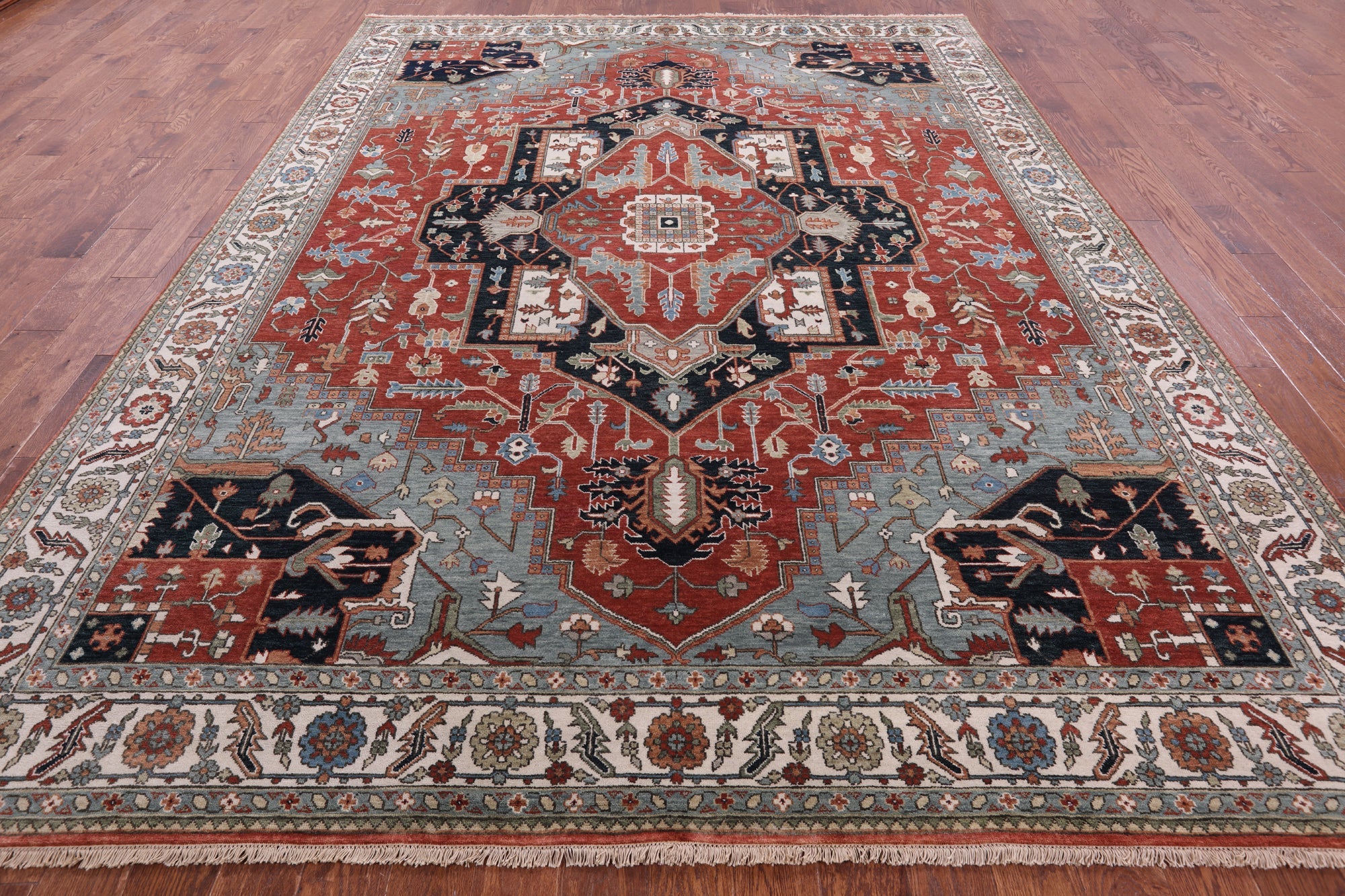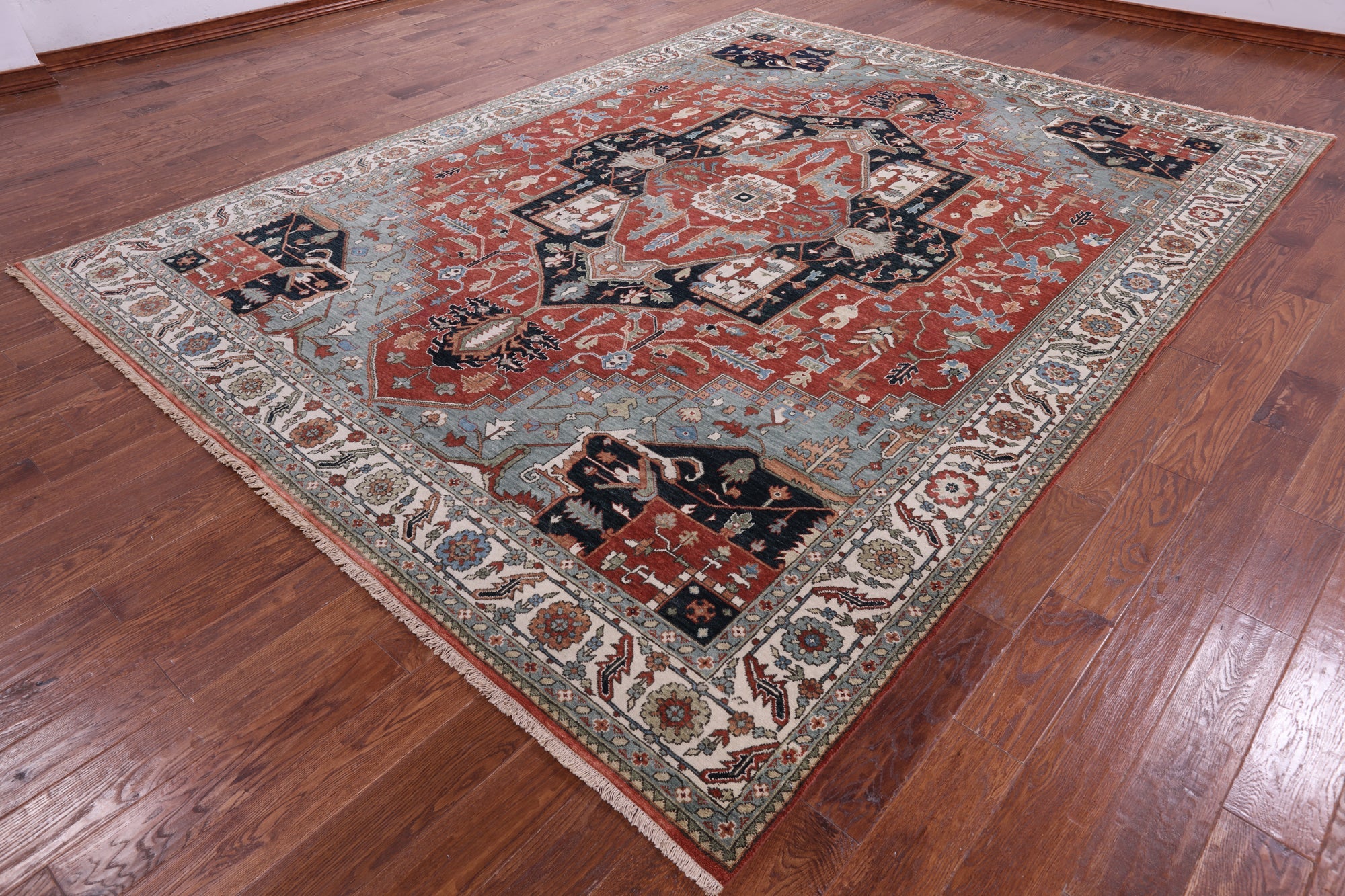 Heriz, Serapi rugs are well known for their bold and angular designs. Many being symmetric, they withhold boldly done geometric and floral-inspired shapes. These shapes are brought out with rich reds, blues, greens, and yellows contrasted against ivory. Heriz, Serapi rugs are very elegant and durable, perfect for a variety of different rooms and spaces within a home.