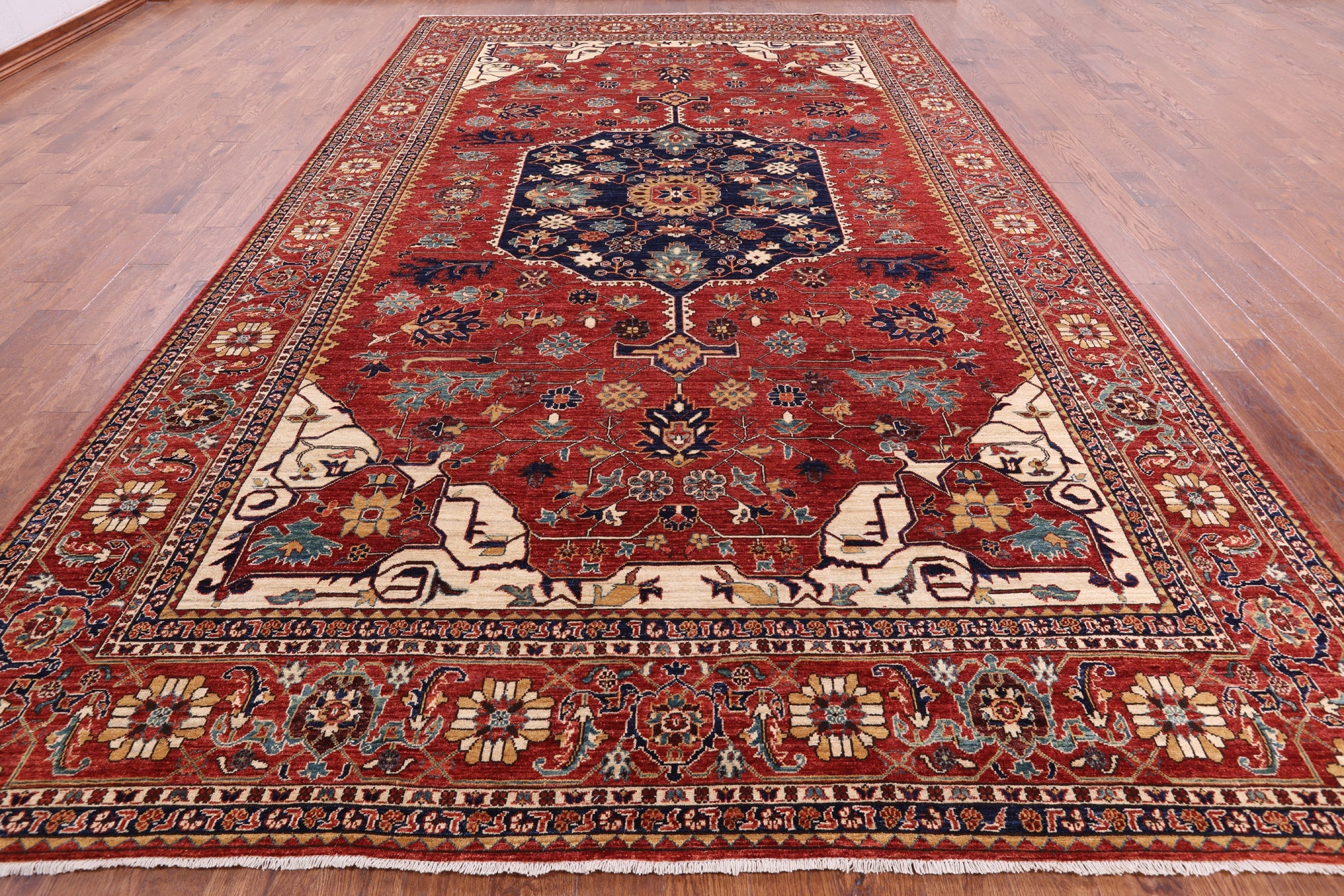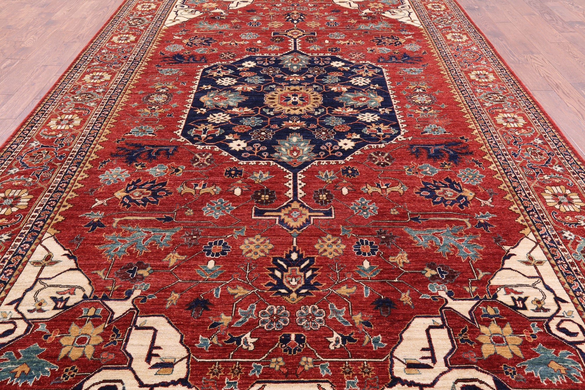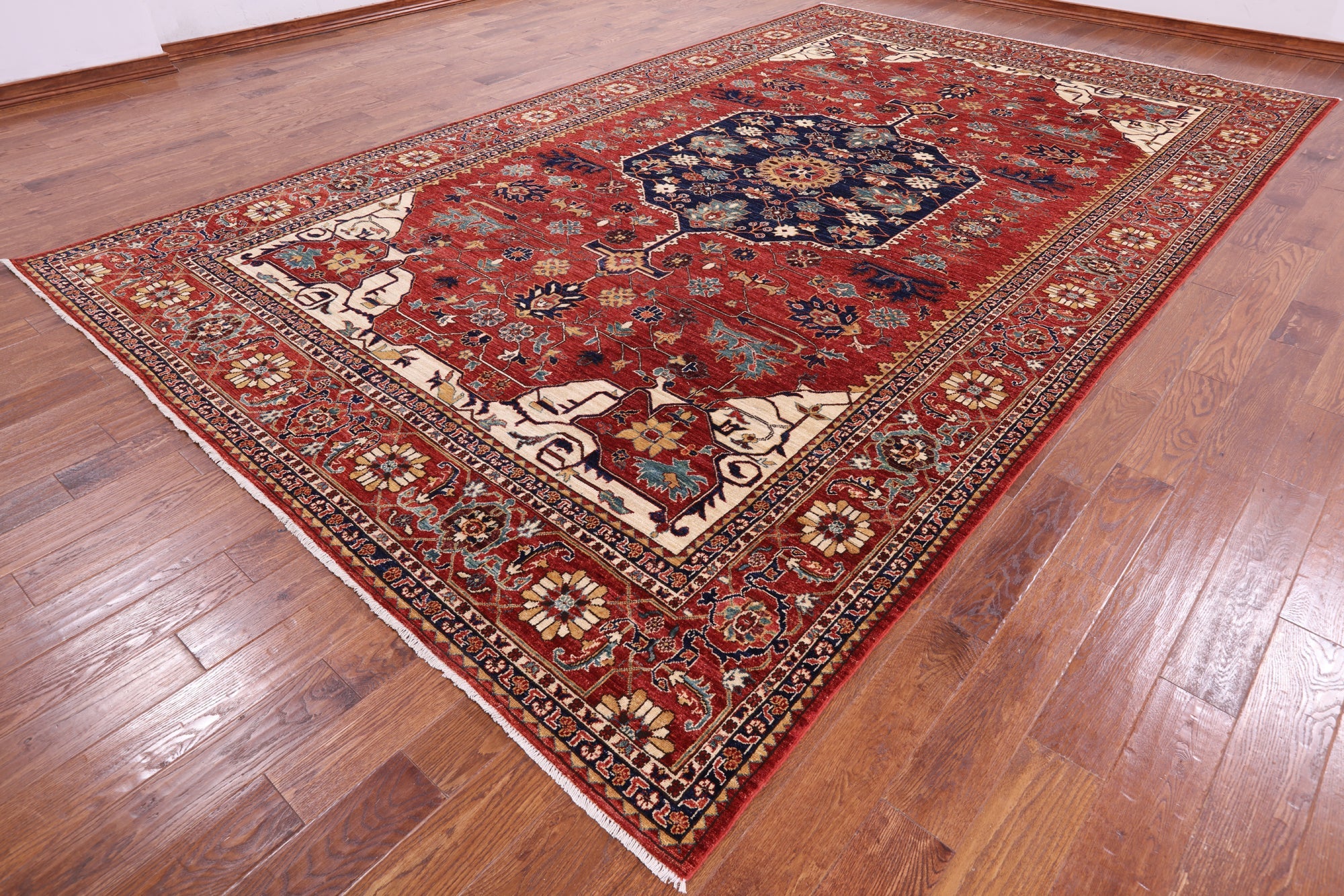 The nature-inspired color palette of Serapi/Heriz rugs gives them an antique look, which has historically sought after for many years. They commonly feature intricate medallions, followed by abstract florals and geometric designs. What makes the Serapi/Heriz so desirable, is their high endurance and longevity under high traffic. Serapi/Heriz rugs are constructed by a labor intensive hand knotting process, made from thick plush piles of wool.