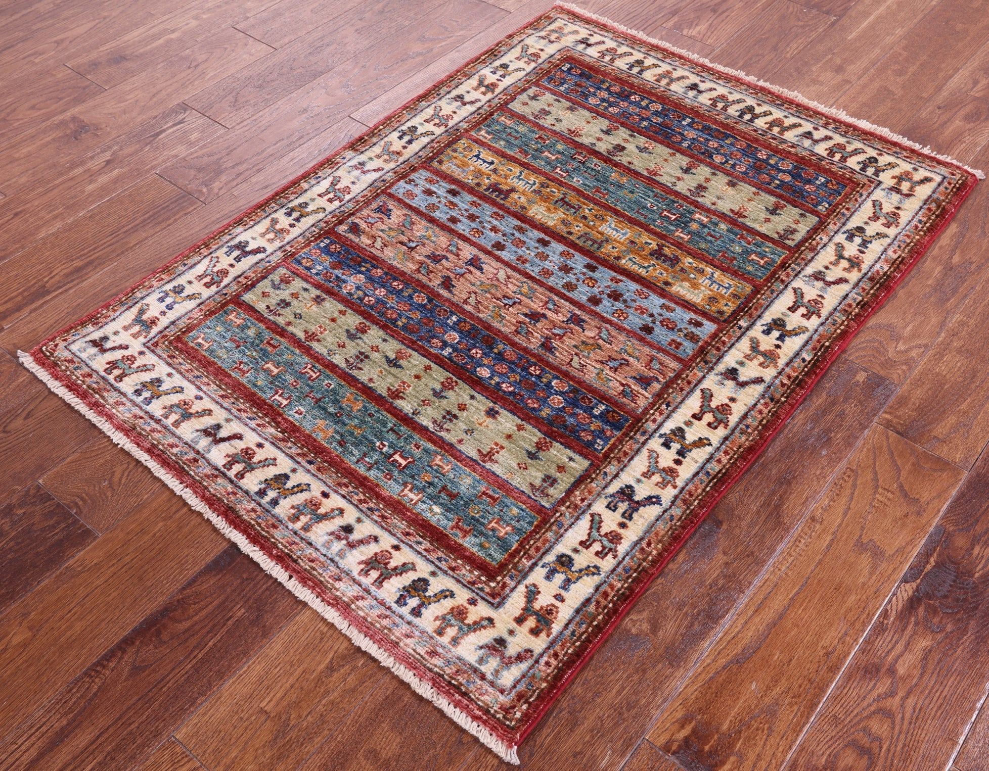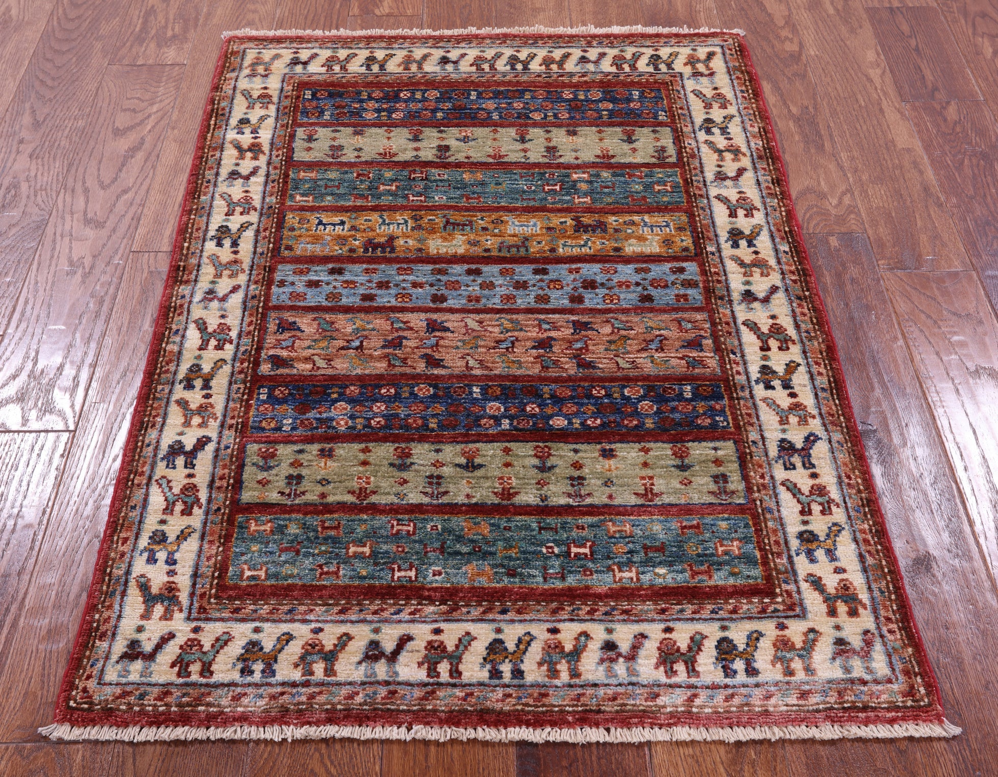 Gabbeh rugs are nothing short of simplistic and tribal, with designs consisting of primarily geometric shapes, animals, and plants. All done in a simplified way and based on the nomadic observation. Commonly brightly colored, these rugs are fun and beautiful and will add a warm touch to any home.