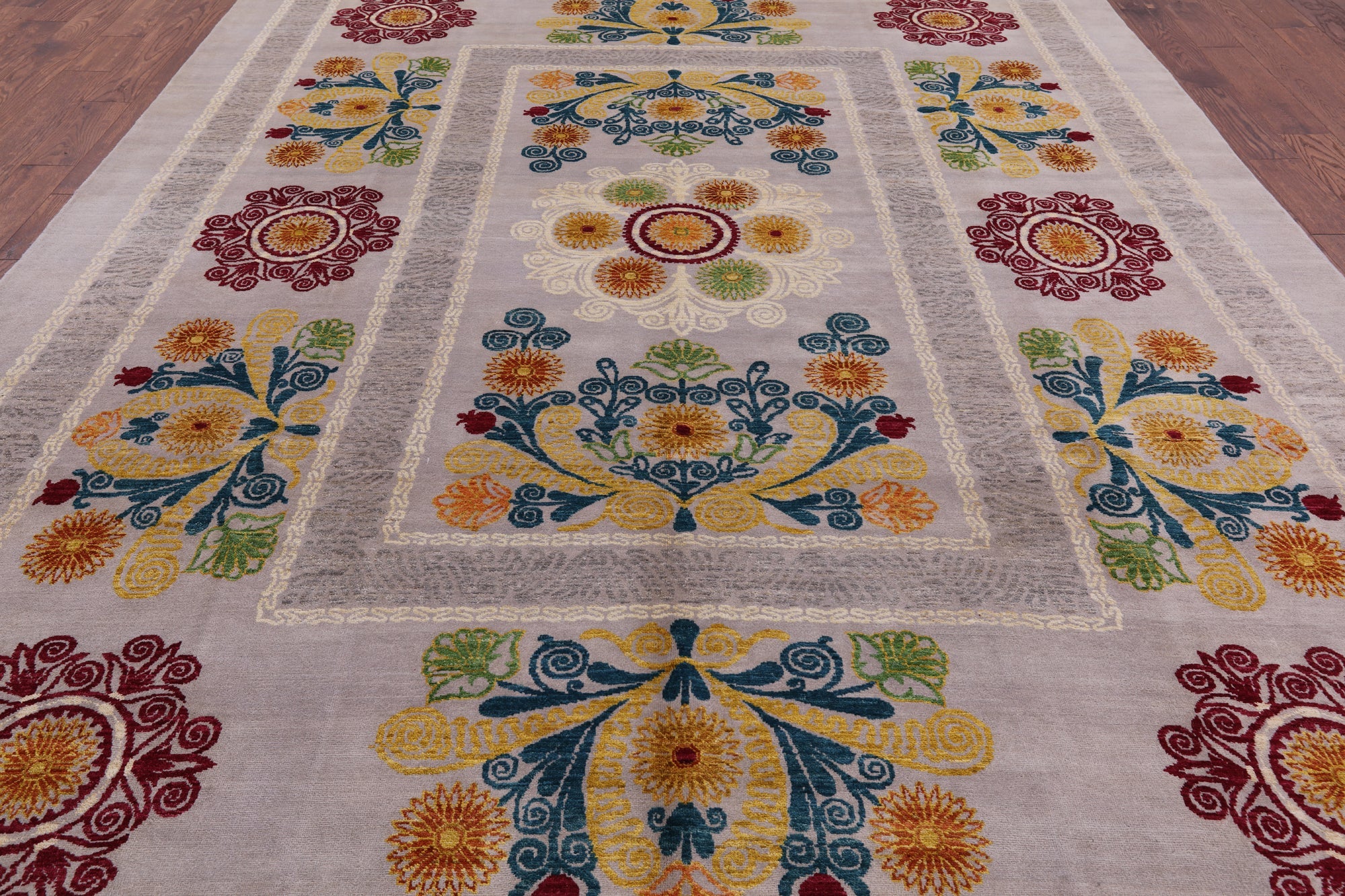 William Morris design are part of arts and crafts movement often including natural forms. These 19th and early 20th century designs are distinctive for their stylized natural forms, their symmetry and their vibrant colors. William Morris patterns are based on nature such thistles, ginkgo leaves, willow trees and flowers. These modern hand knotted rugs are woven with high quality wool, silk or both.